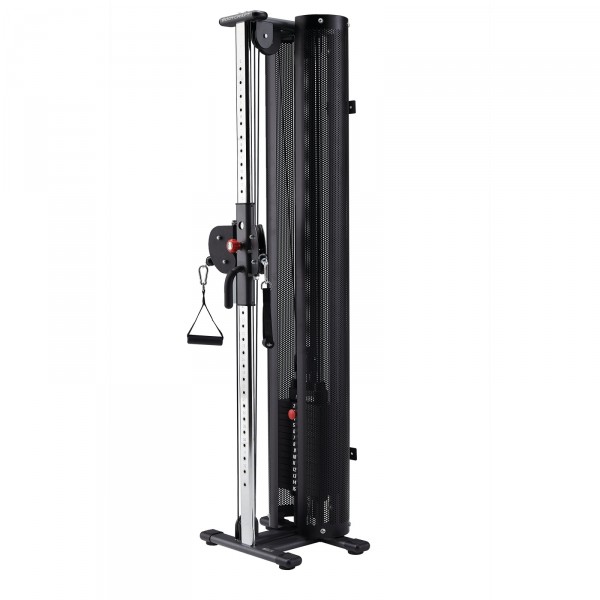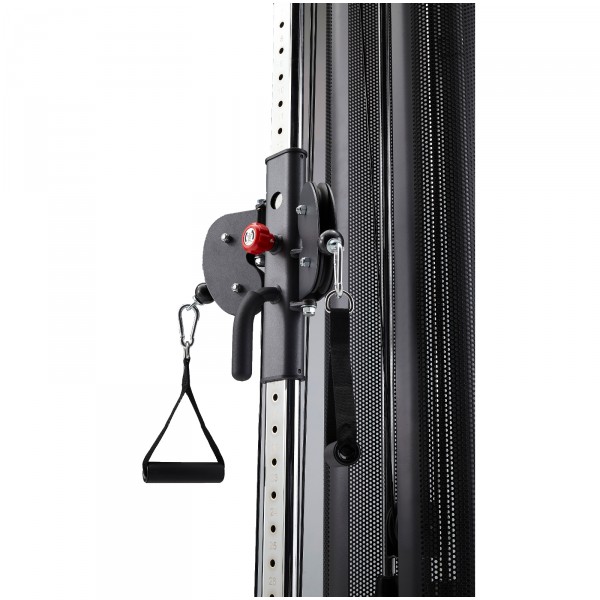 Una polea doble permite realizar ejercicios con una o ambas manos (por ejemplo, el ejercicio de mariposa). Las poleas están equipadas con mosquetones para poder utilizar otras asas de levantamiento. La cuerda para tríceps es un accesorio muy eficaz para fortalecer los bíceps y tríceps. Otra ventaja de los mosquetones es que permiten conectar las dos poleas para duplicar la resistencia.