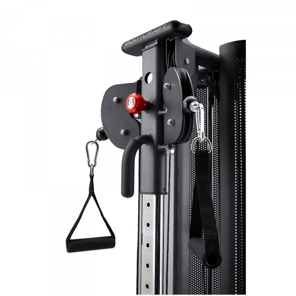 La polea Bodycraft es un equipo versátil que destaca por su reducido tamaño (aproximadamente 0,25 metros cuadrados). Esta polea permite realizar numerosos ejercicios para trabajar todos los grupos musculares.